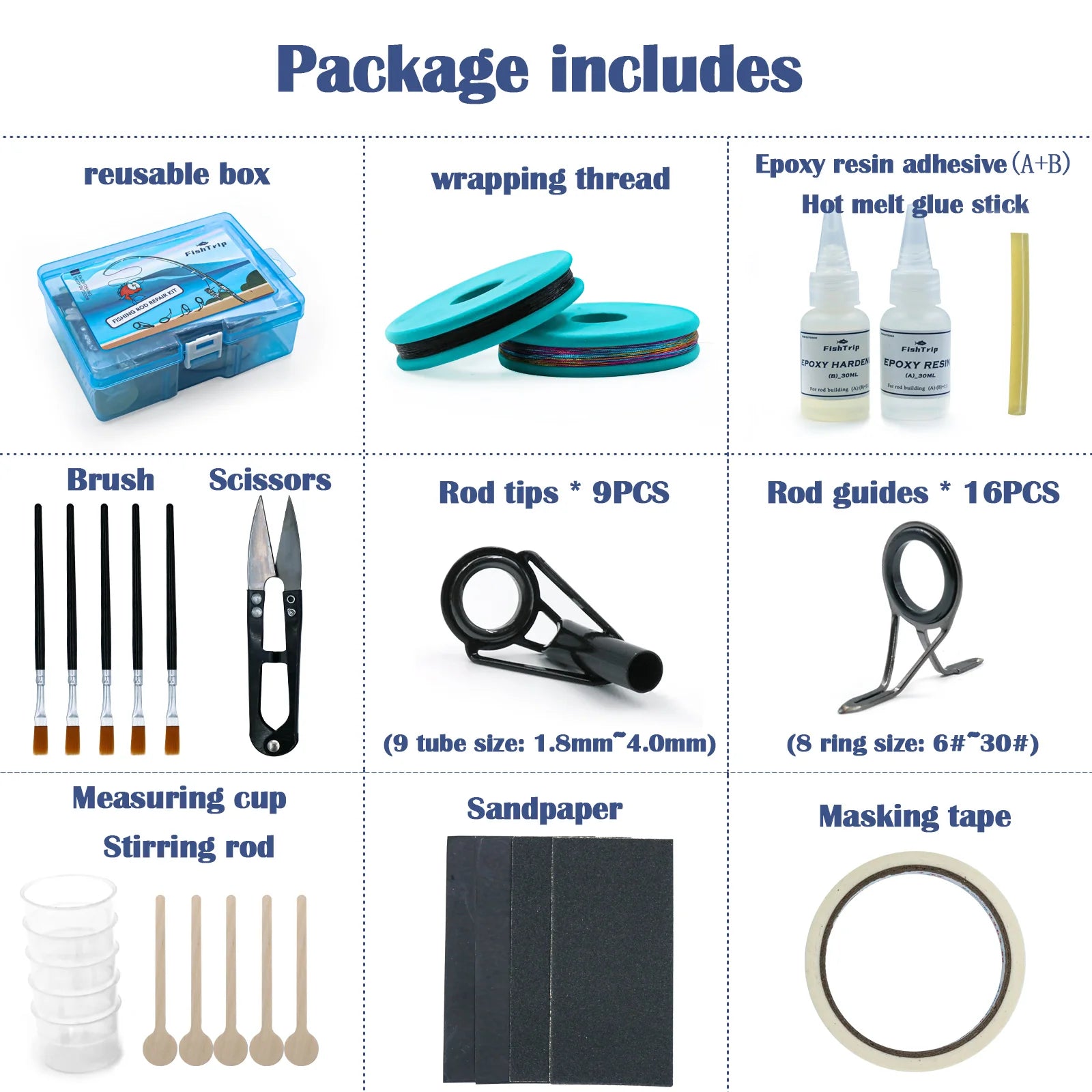 Easy to install and storage: To make it easier for you to repair your rod, we have Equipped epoxy resin adhesive, black wrapping thread, brush, scissors, tape, sandpaper, hot melt stick for you. You can successfully repair your fishing rod with one purchase.