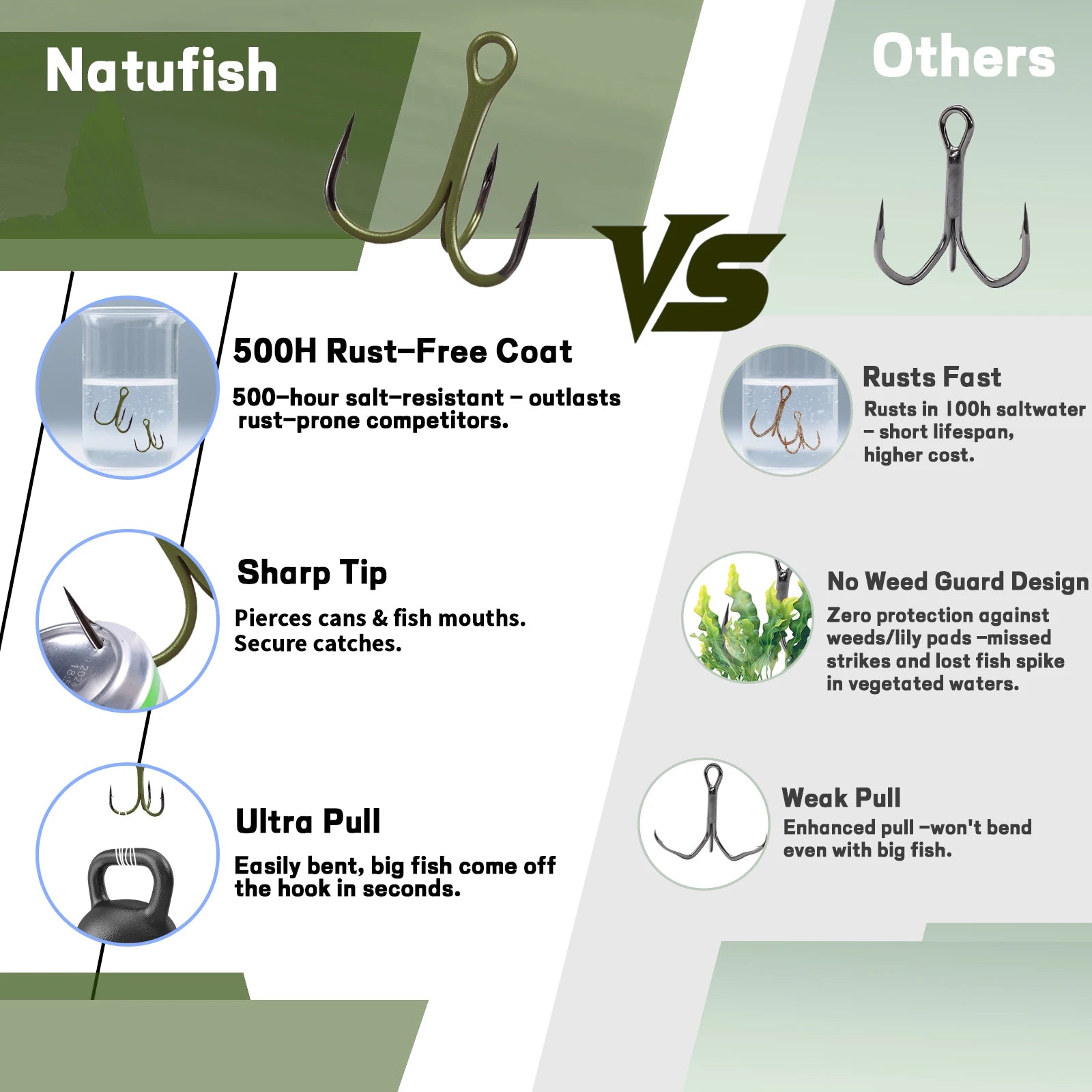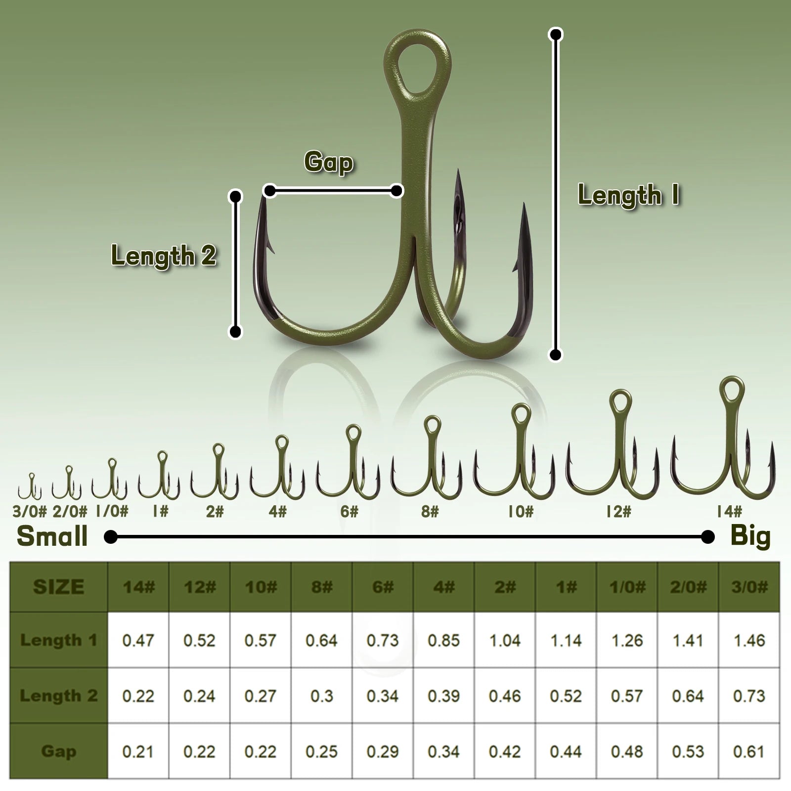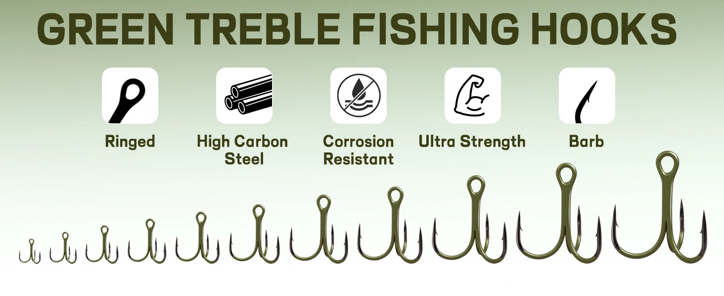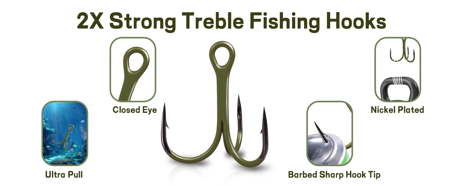 These 3 hooks provide excellent bite coverage for fishing artificial hard lures.Examples include crankbaits, spinners, topwater and homemade lures.