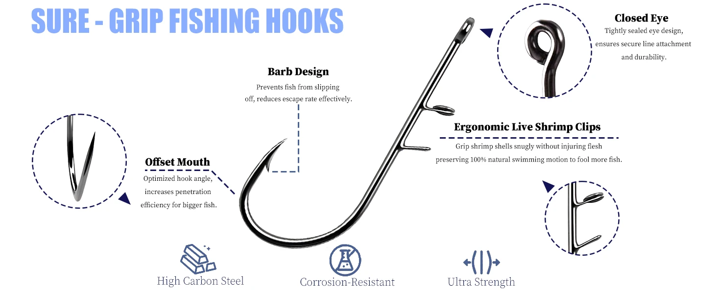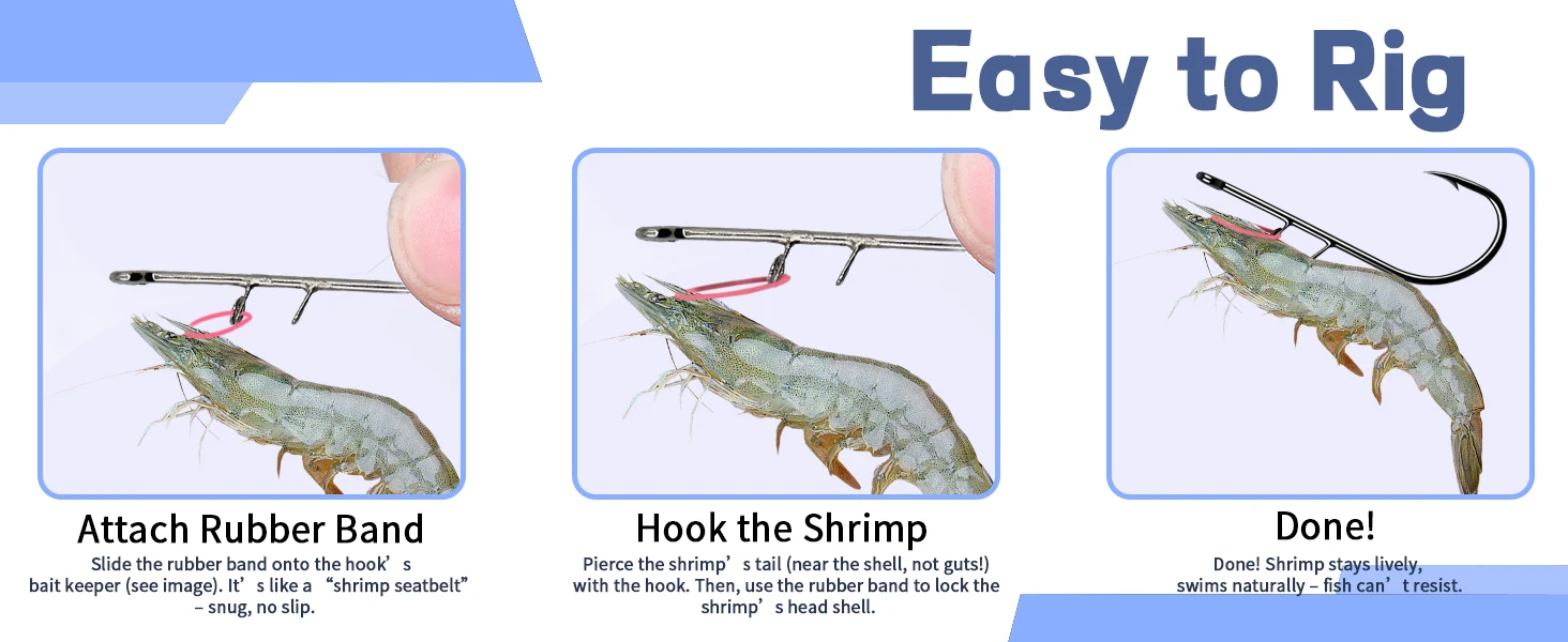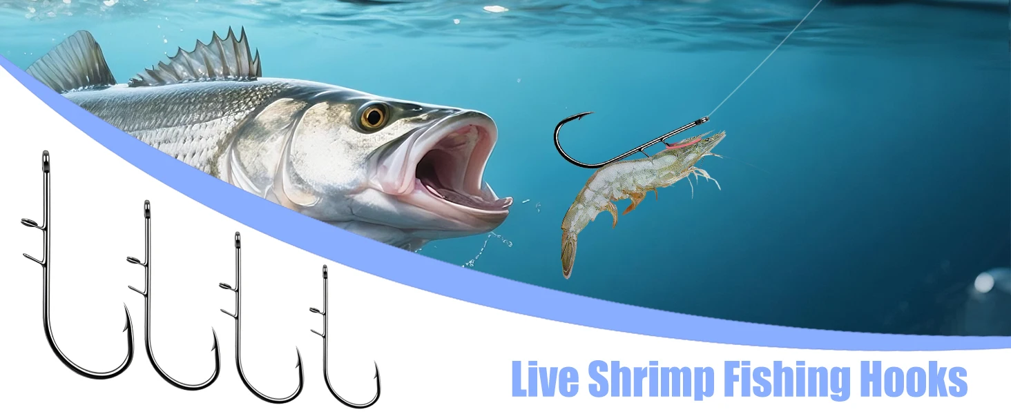 The hook is cleverly designed to attach securely to shrimp shells without piercing or harming them, ensuring they stay at maximum vitality in the water for longer, making them more appealing to larger fish.