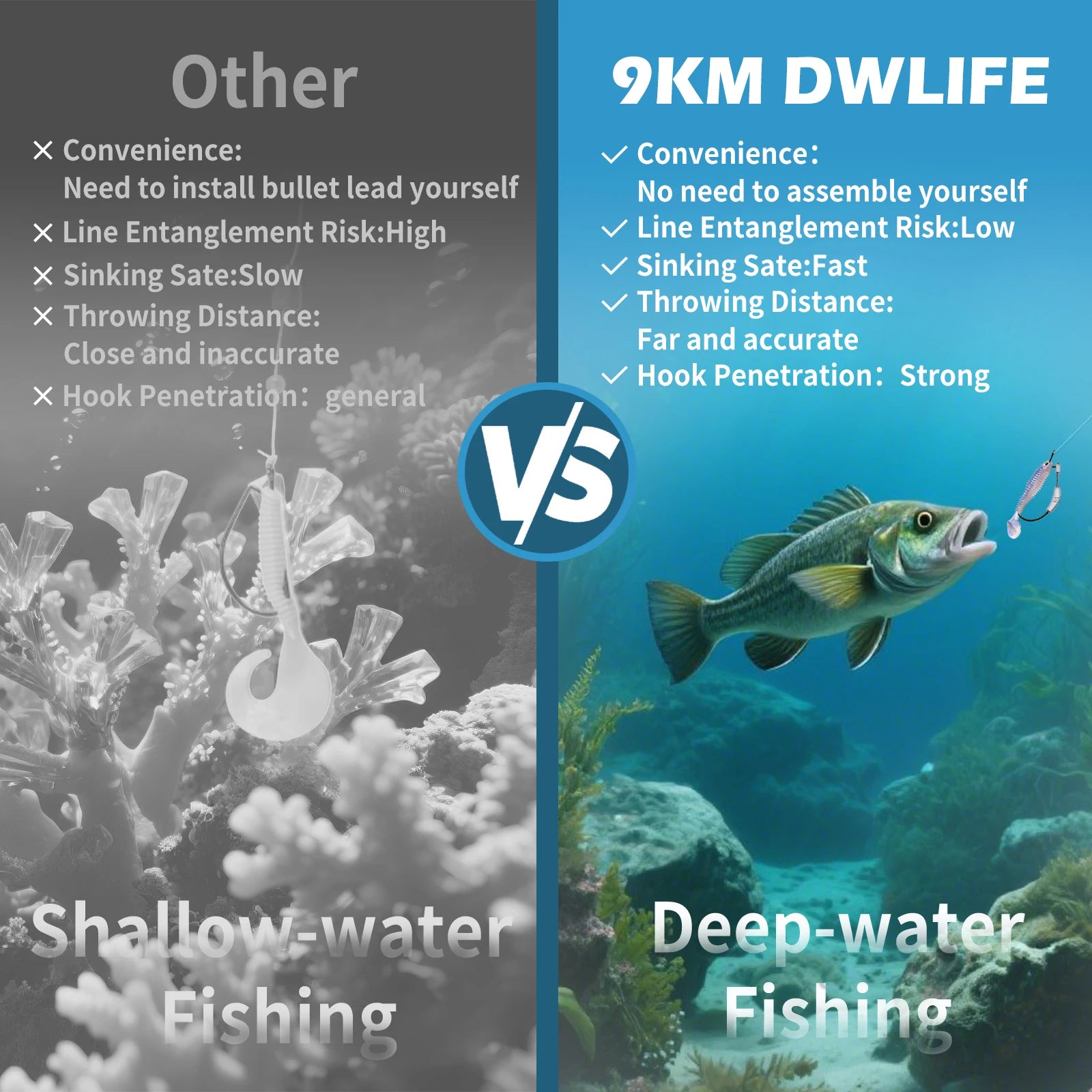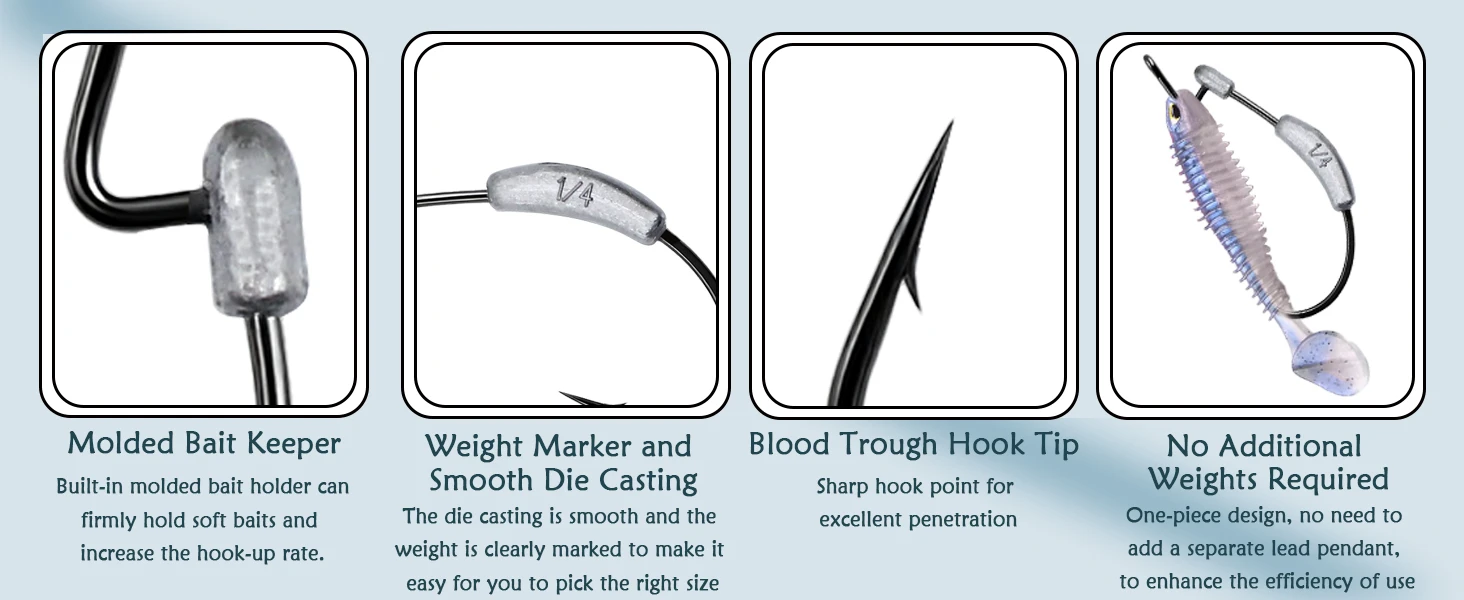 Weighted Hooks-Precisely weighted shank allow the bait to be cast further with more accuracy, and sinks your bait directly into the strike zone for more aggressive bites.