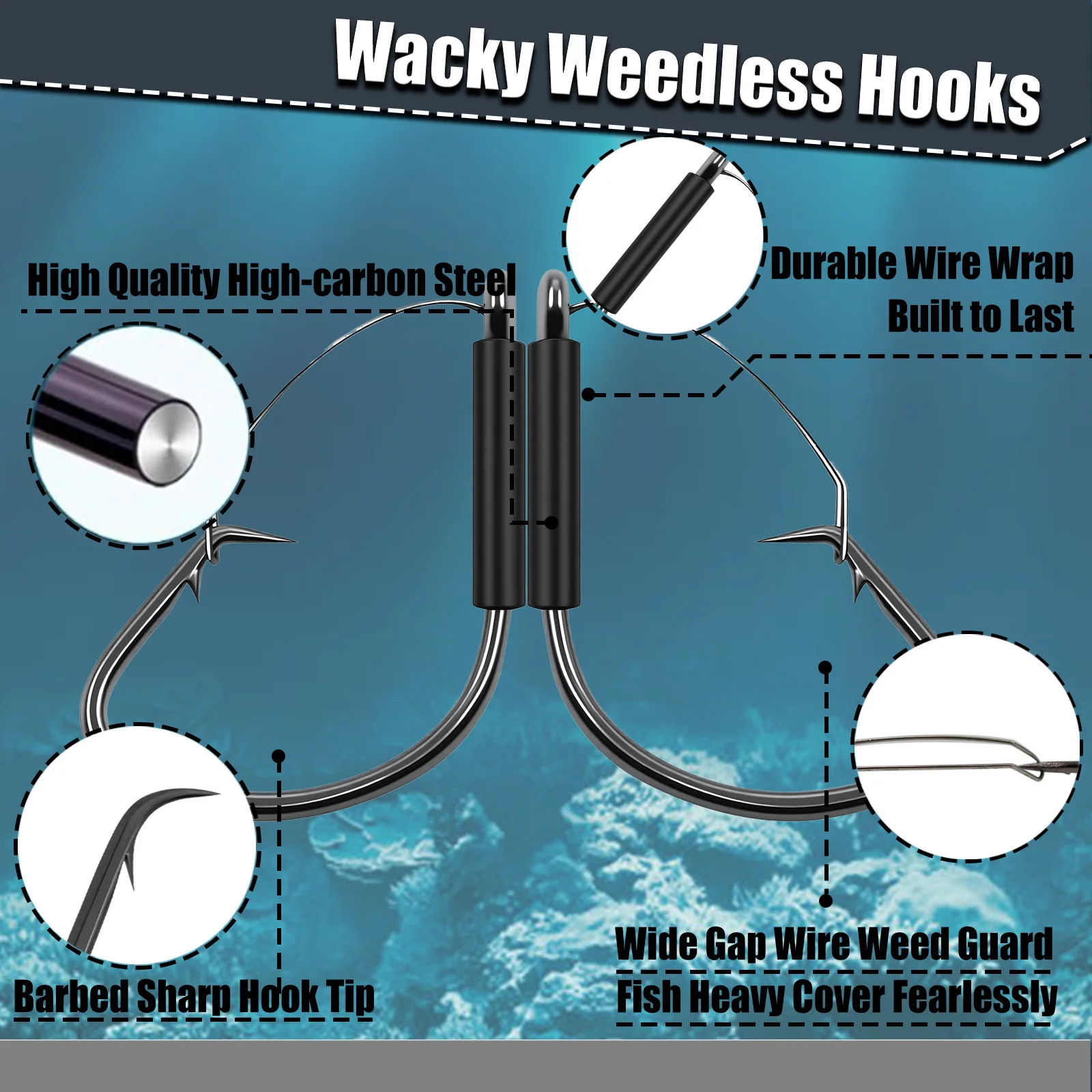 Each wacky rig fishing hook is designed with a wire weed guard, which makes your lure snag-free, allowing you to put the hook along the shore, under docks, or around rocks,