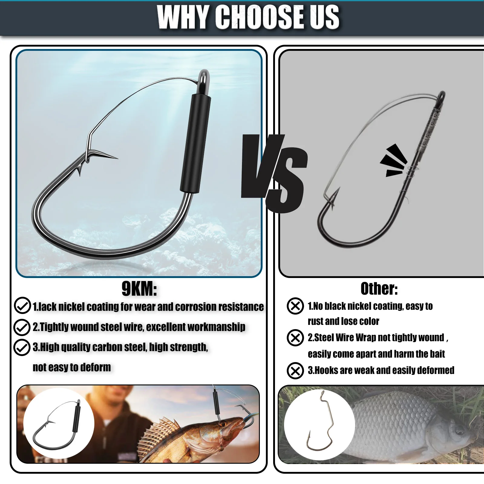 The wacky worm hooks are made by fine workmanship with quality carbon steel material, sturdy and durable to withstand the weight of fish, strong and reliable, you can store and use them for a long time