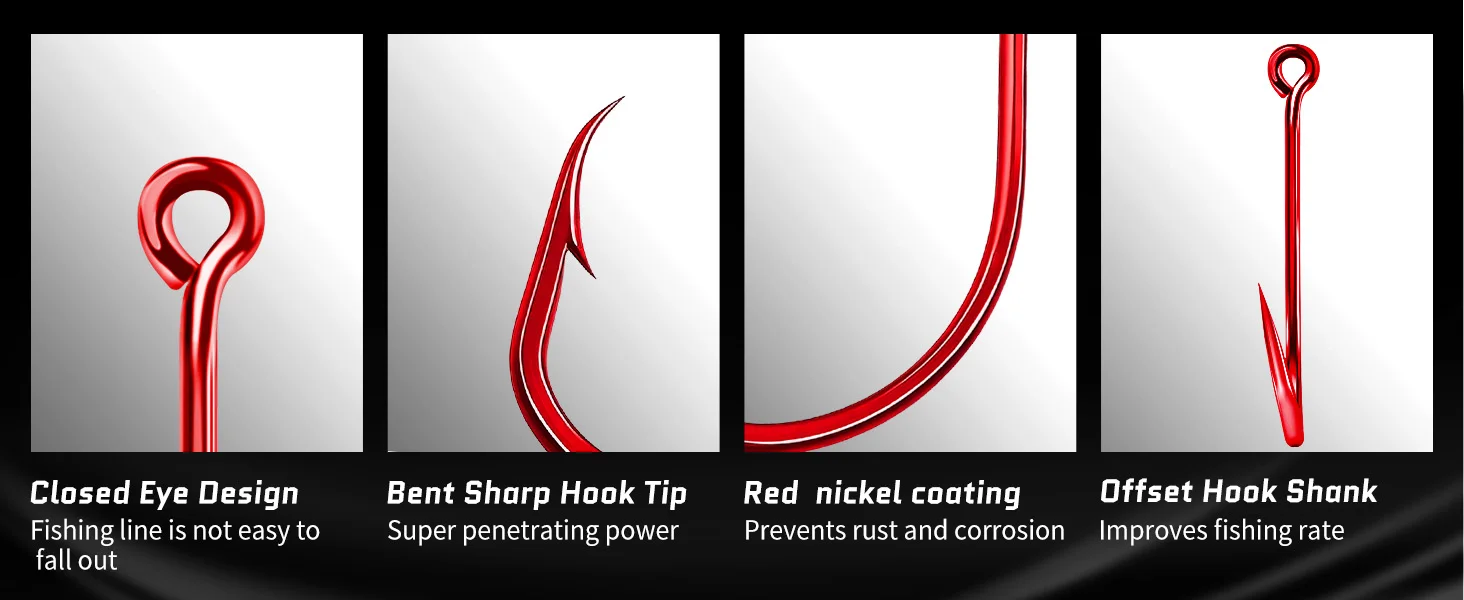 The fishing hooks are really sharp with special barbed design,for less mortality rate.offset point, sharp hook point and barb easier to pierce the fish's mouth, reduce the escape rate and death rate of fish.