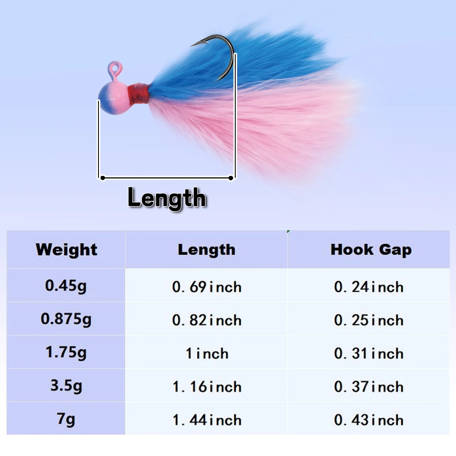 Multi-Spec for All Water Layers: 5pcs crappie jigs (1/64 to 1/4oz bright hues). Light sizes for creek trout, heavy sizes for deep bass and walleye, works in clear and stained waters.