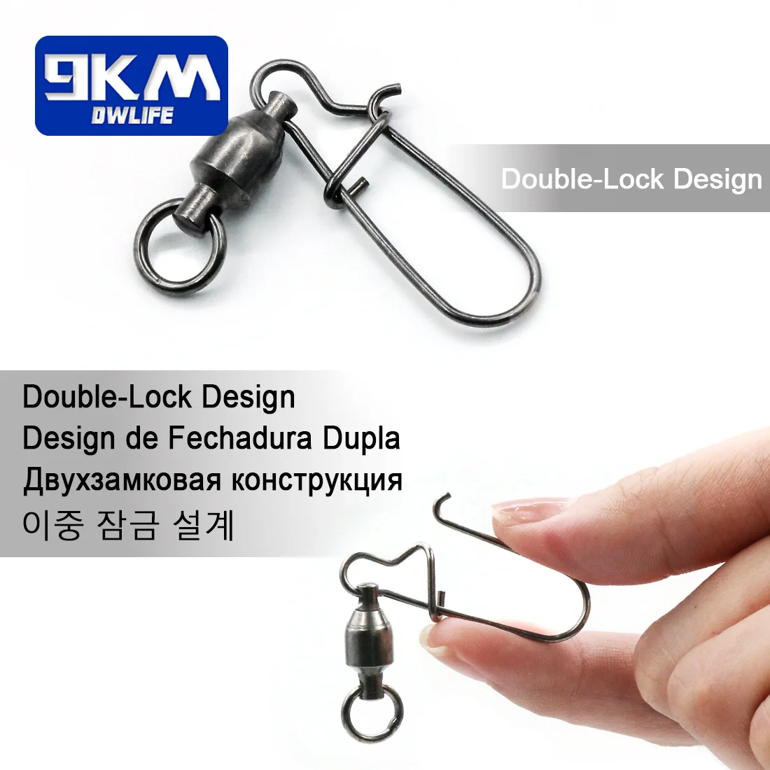 [ 9KM DWLIFE Ball Bearing Fishing Swivels with Duo Lock Snap ] anti-rust, anti-corrosion, wear-resistant, impact-resistant. Duo lock is easy to open and close, saving anglers time when changing fishing lures. The unique design of the clip gives this cilp greater pulling force.