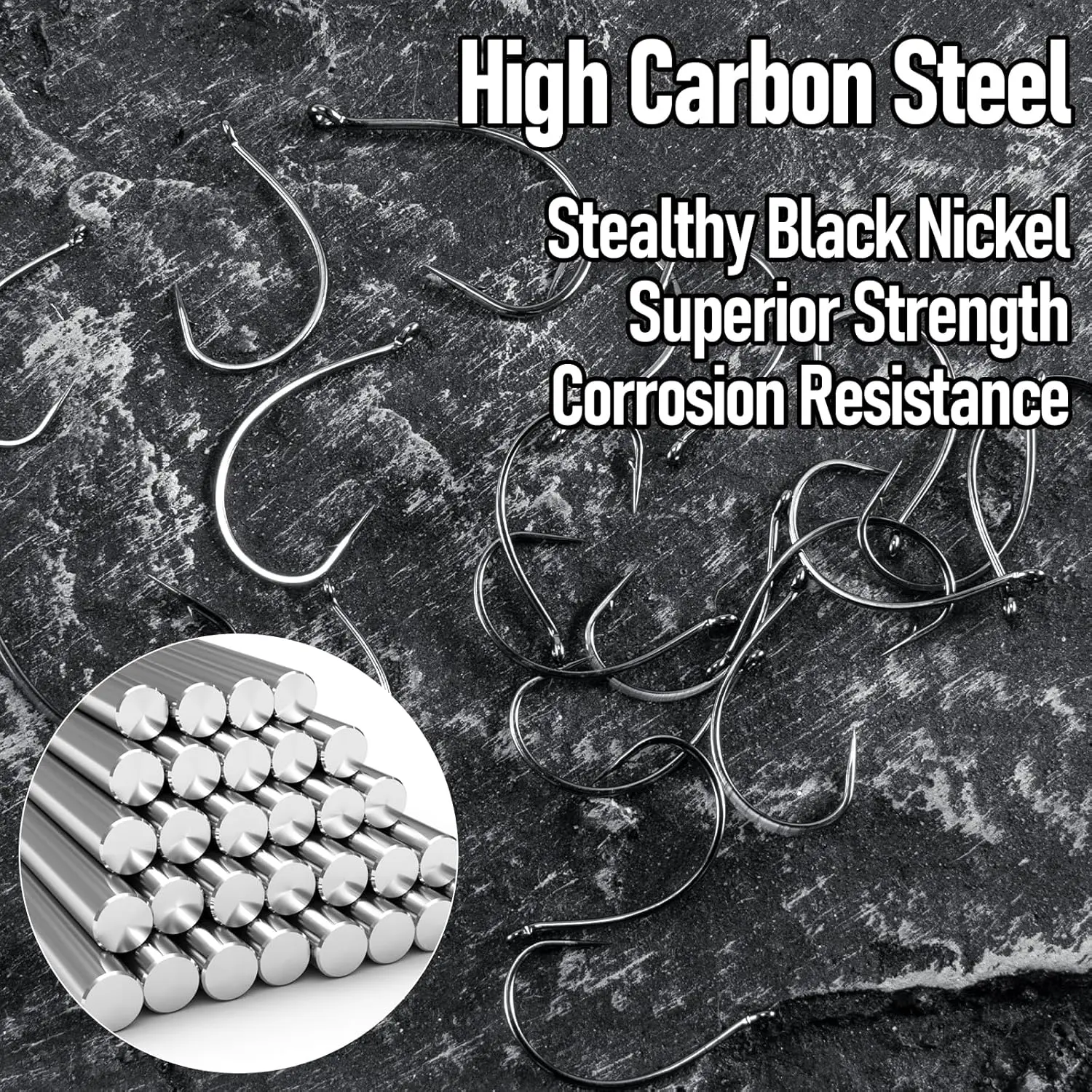 These high-quality fishing hooks are made from high carbon steel, offering durability and versatility for various fishing scenarios, including drop shot rigging and wacky rig applications.