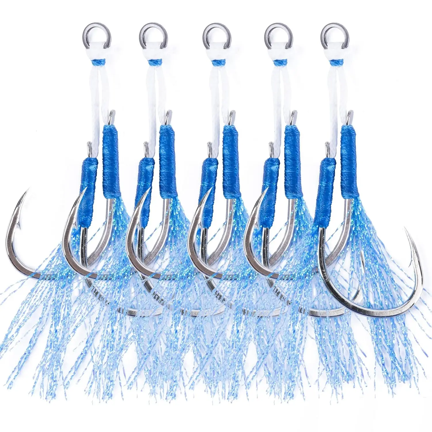 Jigging assist hooks composed of sharp circle hooks, strong braided line, stainless steel split and crystal flash tassel.