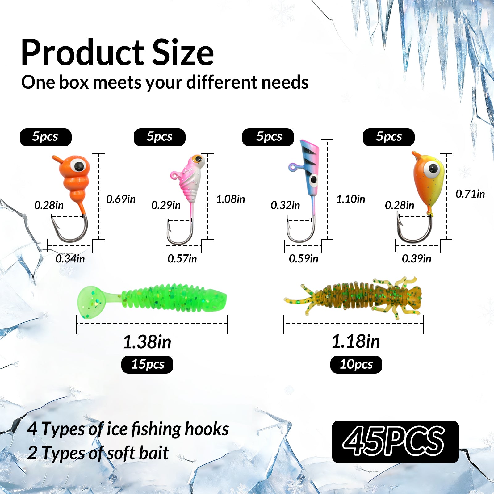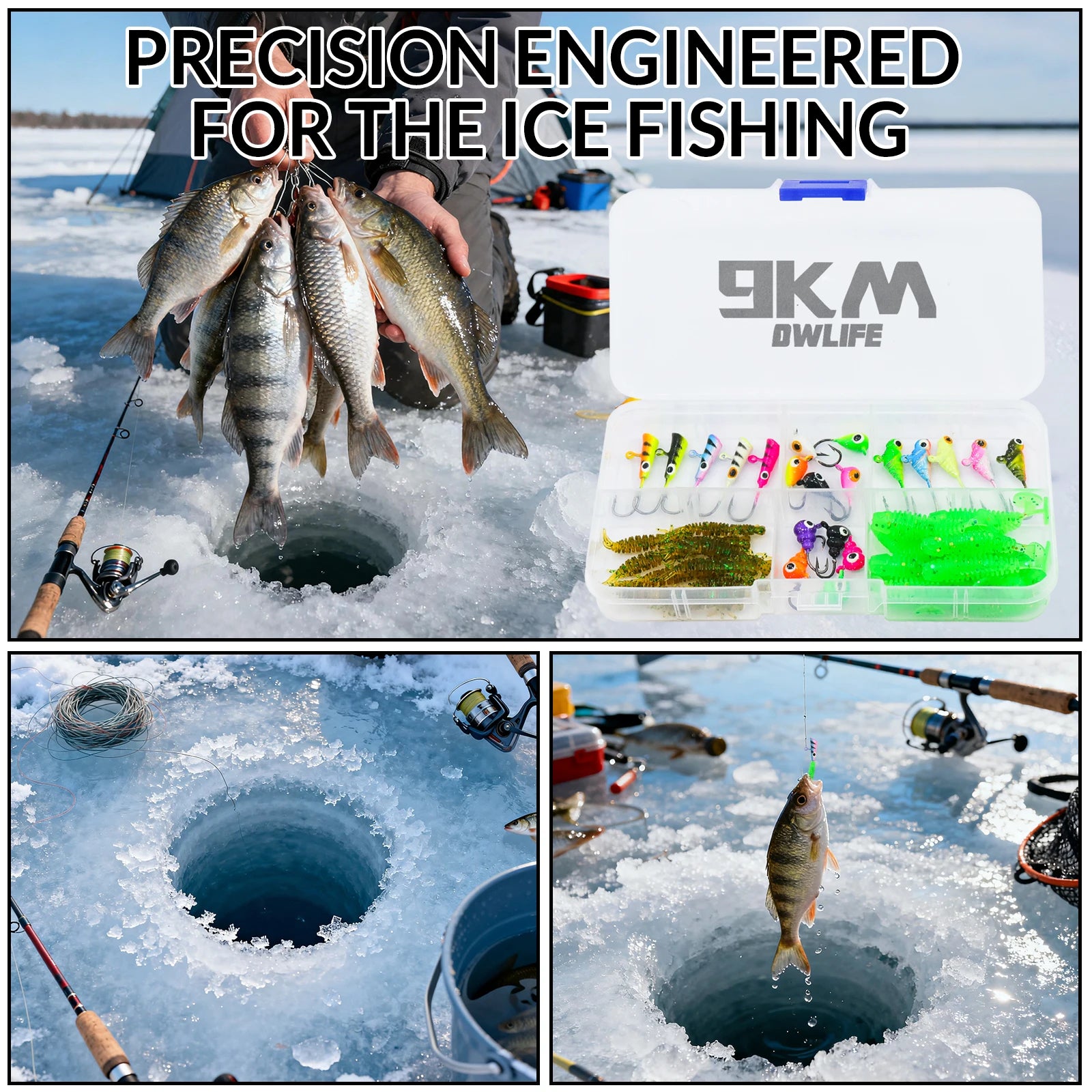 Get everything you need in one box. This ice fishing kit includes ice fishing jigs and realistic soft baits, all stored in a durable, organized tackle box. It's the perfect ice fishing gear for both beginners and experts targeting panfish and walleye.
